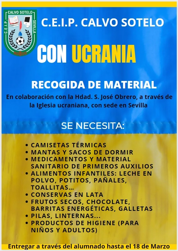 Desde el CEIP Calvo Sotelo, ante la situación humanitaria creada por la guerra en Ucrania, sentimos la necesidad de colaborar como colectivo y aportar nuestro pequeño grano de arena. Por eso os animamos a participar en la campaña de recogida de material médico y humanitario que vamos a realizar. El material recogido será enviado a la Hermandad de S. José Obrero, que colabora con la Iglesia de Ucrania, con sede en Sevilla.