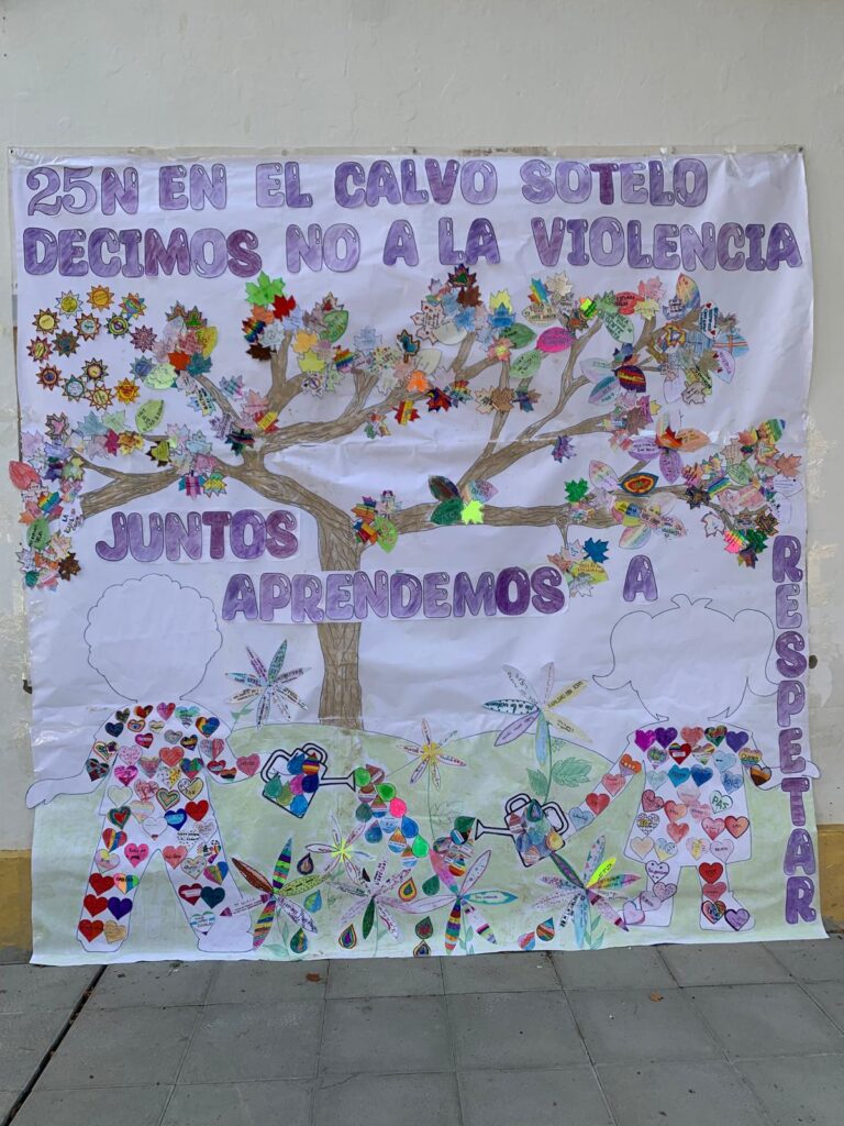 Nuestro colegio ha conmemorado el 25 de noviembre con una jornada de sensibilización y reflexión en la que se ha realizado la lectura de un manifiesto contra la violencia, destacando la importancia del respeto, la igualdad y la convivencia pacífica. Como actividad central, el alumnado ha participado en la creación de un mural colectivo bajo el lema “Juntos aprendemos a respetar”, símbolo del compromiso de toda la comunidad educativa con una educación basada en valores. A través de esta iniciativa, fomentamos la empatía, el diálogo y la construcción de una sociedad más justa e igualitaria desde las aulas.