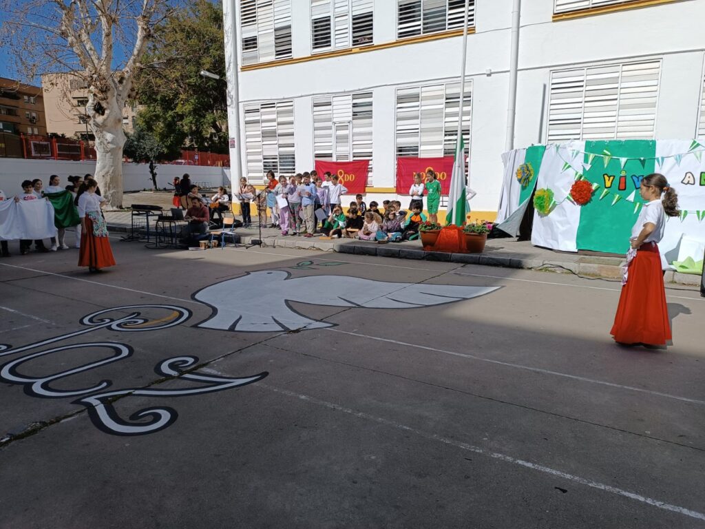 Muestra de las actividades realizadas por el alumnado y profesorado del centro para la conmemoración del día de Andalucía.Baile flamenco, coreografía con la bandera, chirigota de carnaval de Infantil e interpretación instrumental y vocal del himno para culminar con la izada de la bandera de nuestra tierra andaluza.